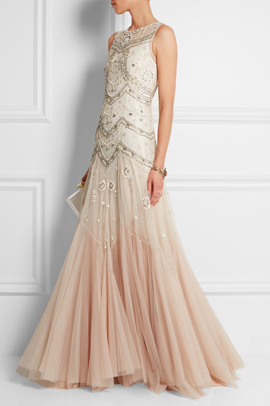 “The most romantic gown,” is how our Junior Buyer Abigail Routley describes this stunning dégradé cream and antique-rose tulle style by Needle & Thread. Hand-embroidered with beads, crystals and opalescent sequins, this piece skims your silhouette before kicking out at the knee into a frothy fluted hem. A discreet ivory crepe de chine slip provides the perfect amount of coverage.
