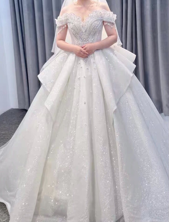 Glitter Starry Sky Wedding Gown is off-shoulder wedding gown adorned with bead detailing. The dress features a fitted bodice with a sweetheart neckline and a ball gown that extends into a long train.