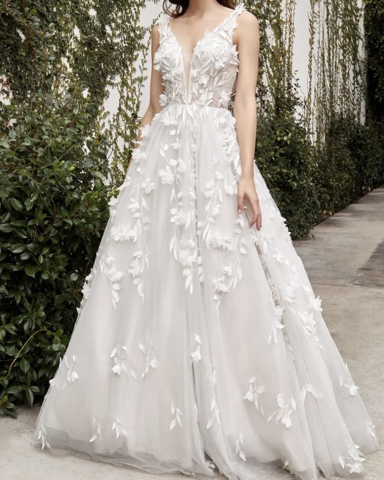 Runaway to a fairytale in this overgrown floral a-line dress. This whimsical A-line gown is cut from layered tulle and embellished with floral beaded lace and three-dimensional flowers blooming along with the silhouette. This fairytale gown has a v-neckline and open swoop back, complete with a deep sheer neckline and sheer side bodice.