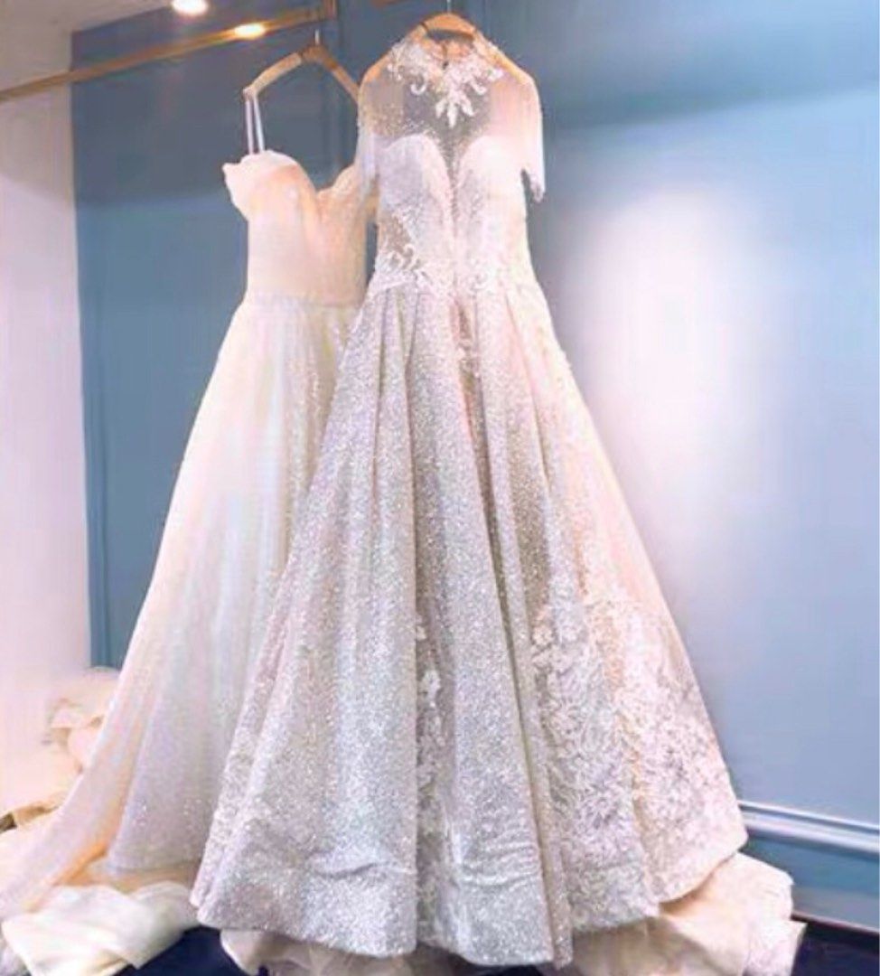 Royal Blink March-in Wedding Dress has a long sleeves cutting and illusion back with big blink long train dress to represent fancy style, suitable for march-in, pre-wedding and wedding party.